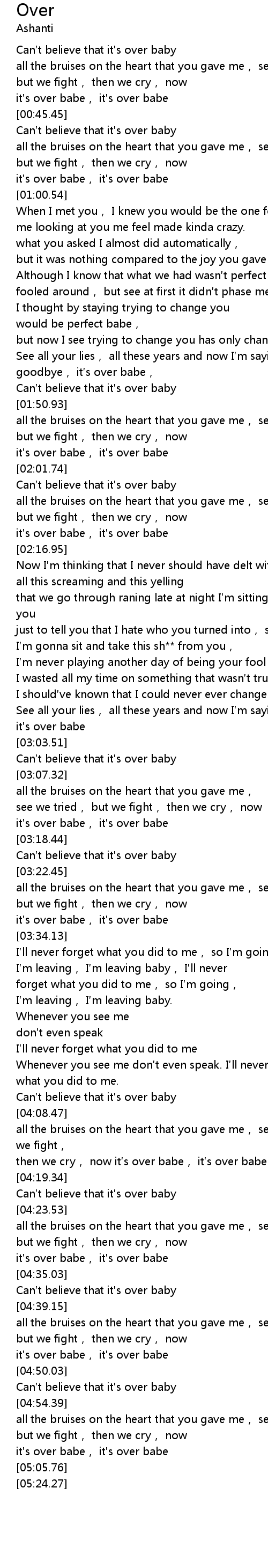 | [00:46.45] | Can t believe that it s over baby |