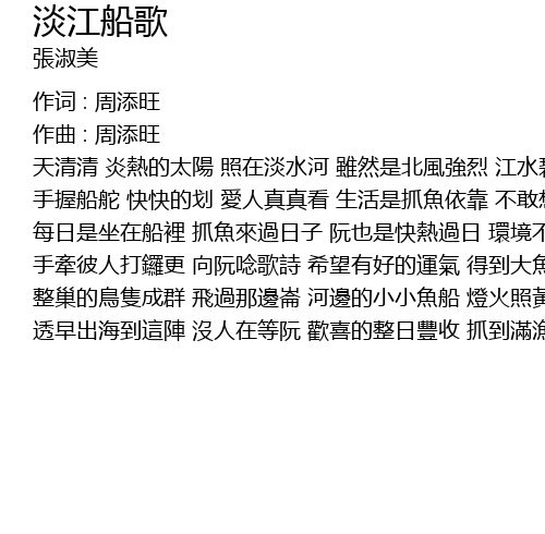 | 天清清 炎熱的太陽 照在淡水河 雖然是北風強烈 江水碧波波 手握船舵 快快的划 愛人真真看 生活是抓魚依靠 不敢想遊玩 | |
