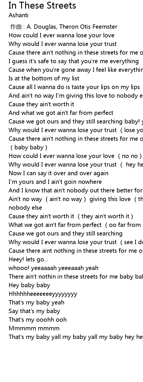 | [00:58.71] | Cause there ain't nothing in these streets for me oh no baby baby (baby baby) |