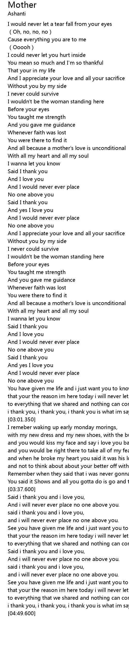 | [00:59.970] | And all because a mother' s love is unconditional |