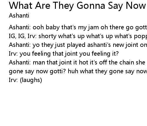 | Ashanti: man that joint it hot it's off the chain she did it again what they gone say now gotti? huh what they gone say now? | |