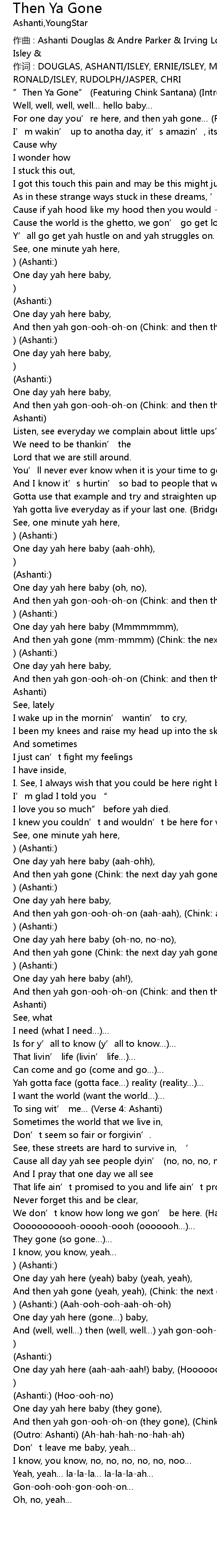 | And then yah gonoohohon Chink: and then the next day yah gone. Spoken: Ashanti | |
