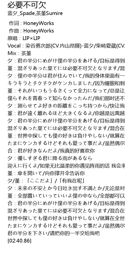 | [00:57.85] | 夕:君の半分にめがけ僕の半分をあげる/目标是得到你的一半也把我的一半分给你 |