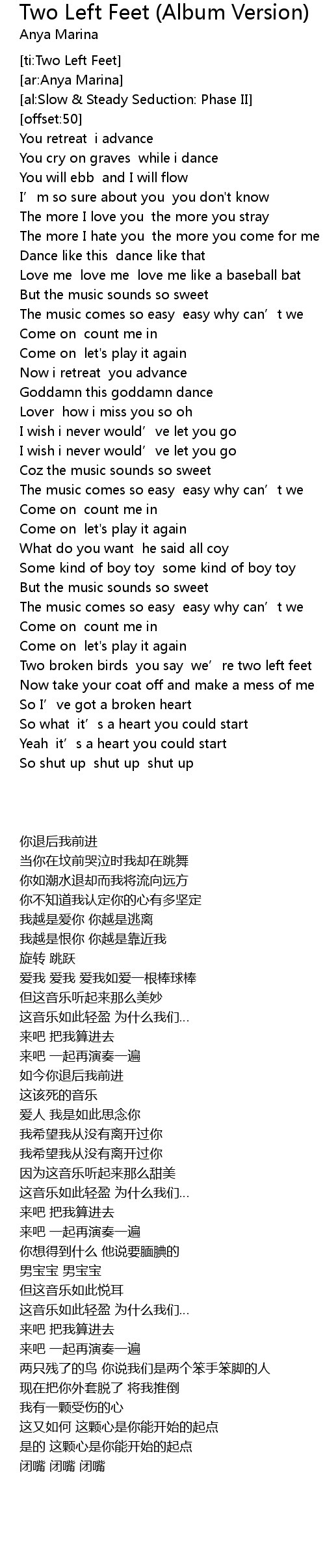 | [02:22.93] | Two broken birds you say we' re two left feet |