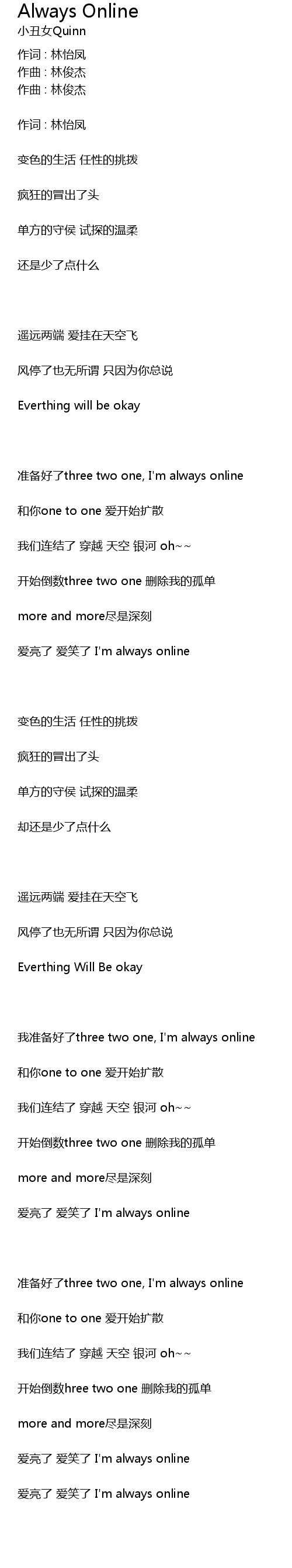| zhǔn bèi hǎo le three two one, I' m always online | |
