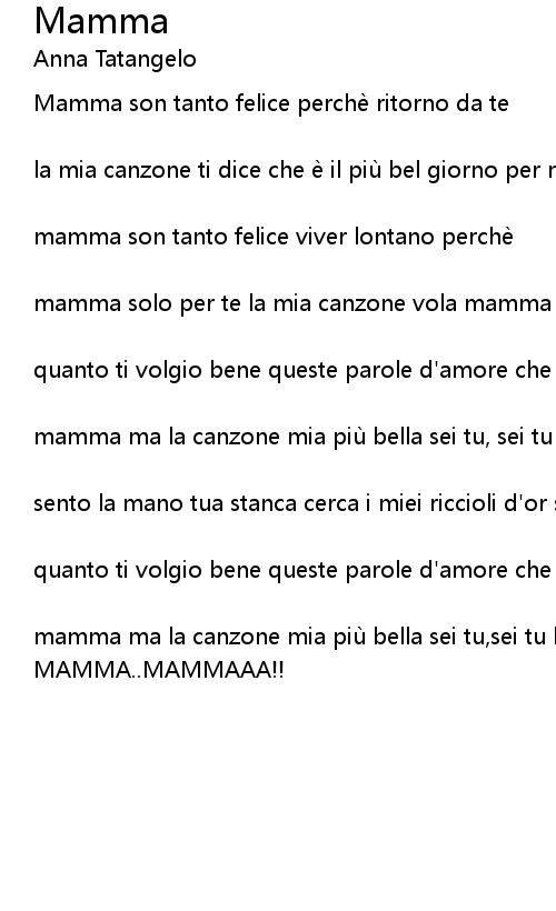 | mamma ma la canzone mia più bella sei tu,sei tu la vita e per la vita non ti lascio mai più | |