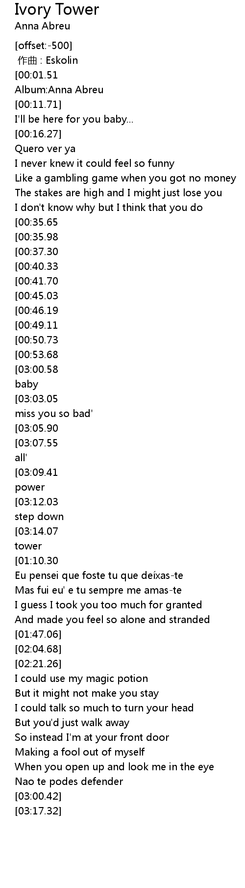 | [03:41.78][00:01.51] | Anna Abreu-Ivory tower |