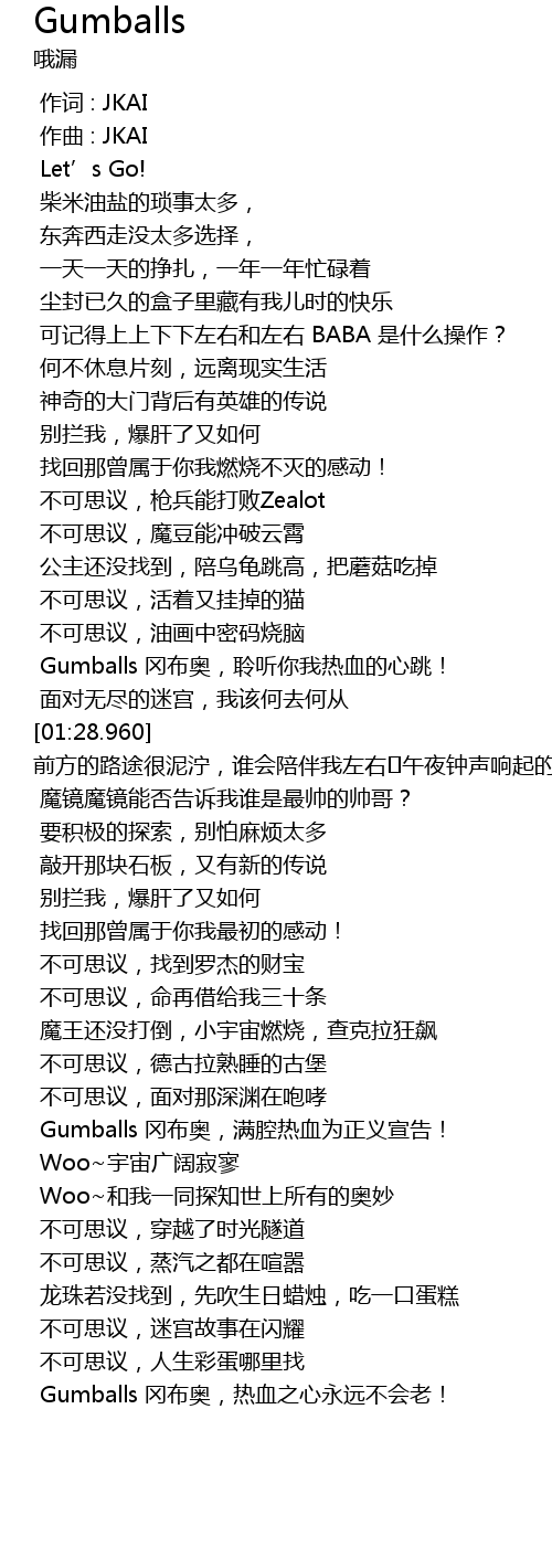 | [01:09.748] | Gumballs 冈布奥,聆听你我热血的心跳! |