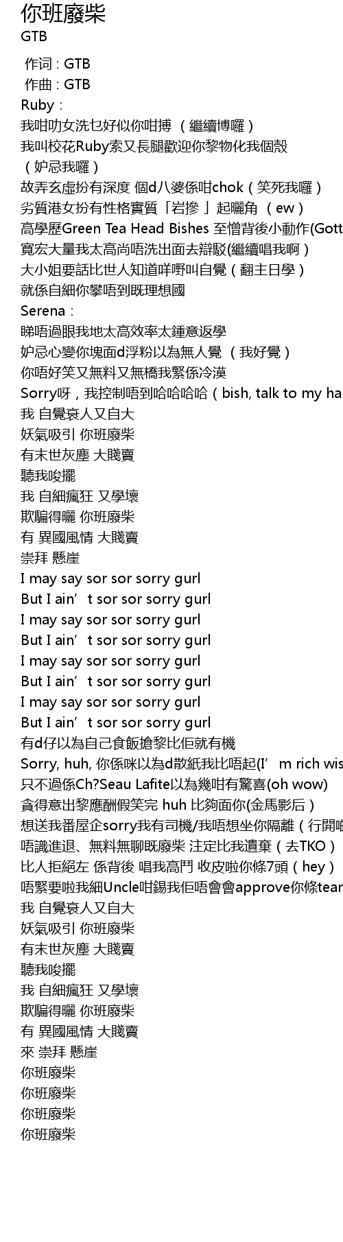 | [01:35.15] | But I ain' t sor sor sorry gurl |