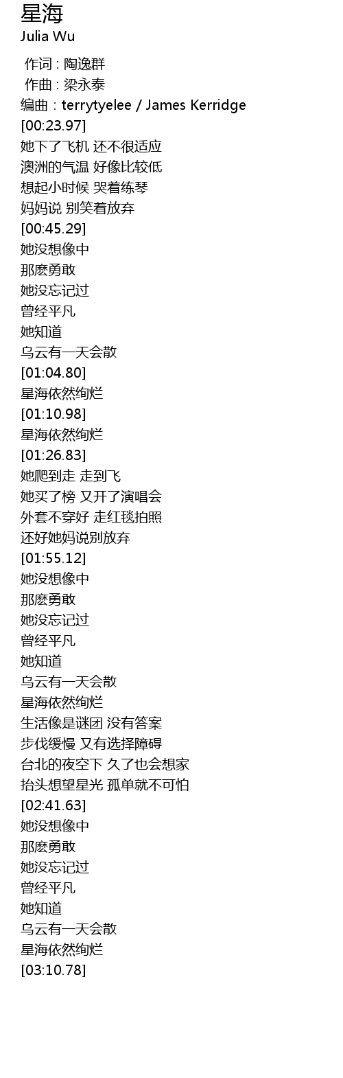 | [00:23.81] | 编曲:terrytyelee / James Kerridge |