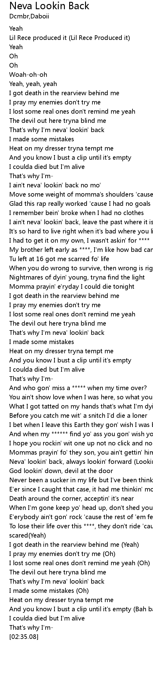 | [00:50.38] | I ain't neva' lookin' back, leave the past where it is |