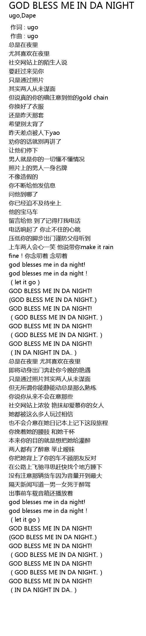| [01:32.938] | (GOD BLESS ME IN DA NIGHT..) |