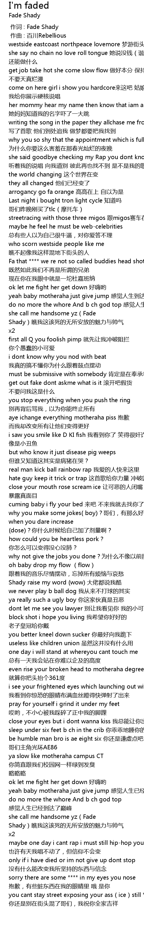 | [03:09.515] | she call me handsome yz Fade Shady qiáo wǒ zhè gāi sǐ de wú suǒ ān fàng de mèi lì yǔ shuài qì |
