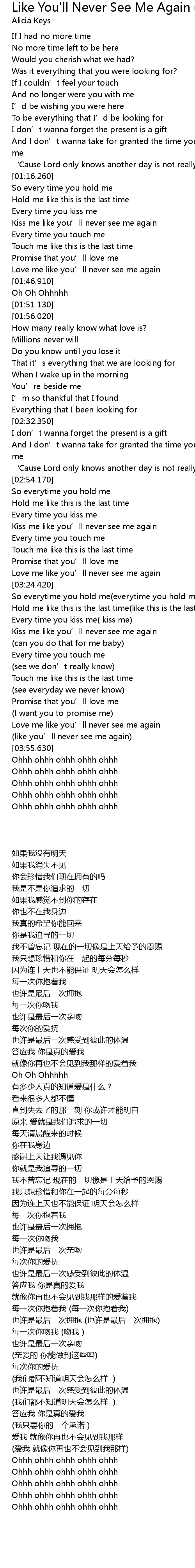 | [01:43.490] | Love me like you’ll never see me again |