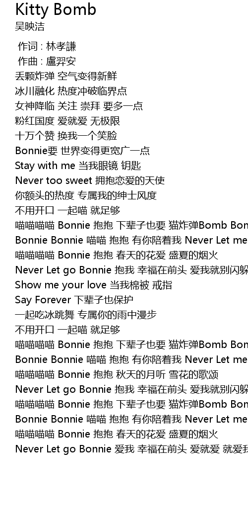 | [00:56.47] | miāo miāo miāo miāo Bonnie bào bào xià bèi zi yě yào māo zhà dàn Bomb Bomb |
