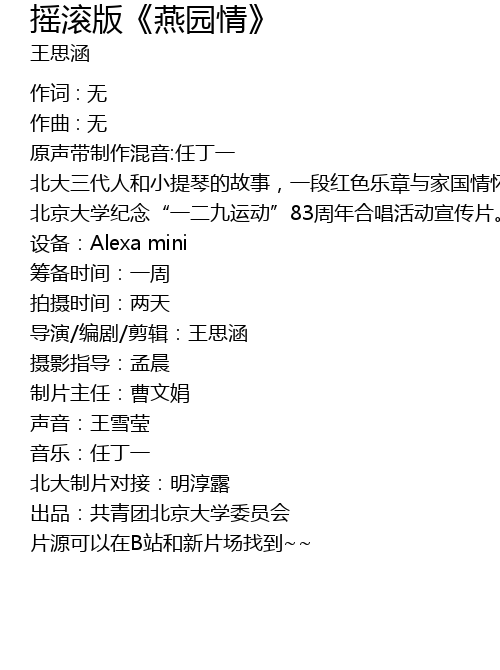 | běi dà sān dài rén hé xiǎo tí qín de gù shì, yī duàn hóng sè yuè zhāng yǔ jiā guó qíng huái. běi jīng dà xué jì niàn" yī èr jiǔ yùn dòng" 83 zhōu nián hé chàng huó dòng xuān chuán piàn. | |