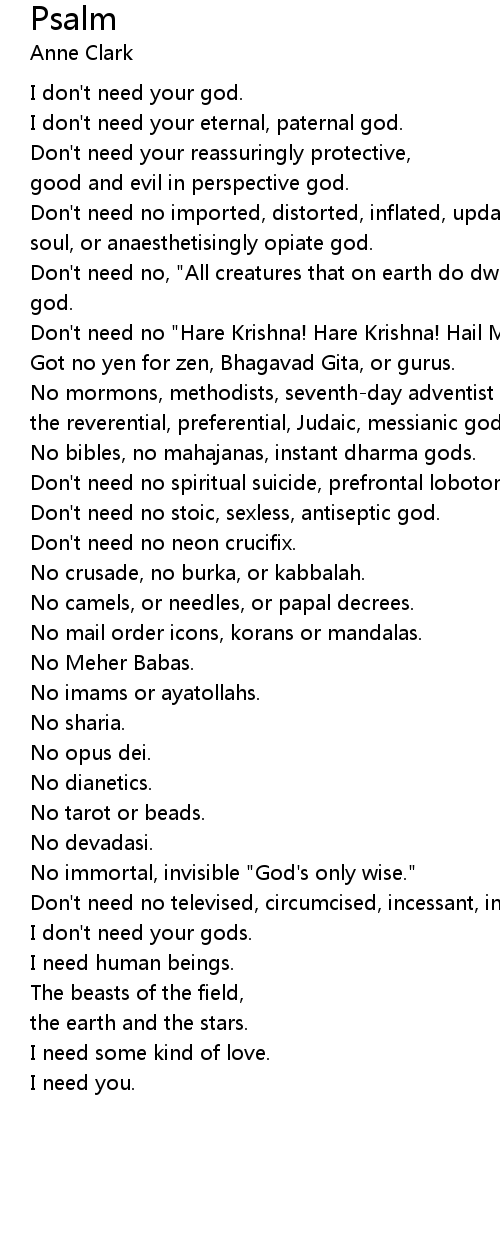 Don't need no imported, distorted, inflated, updated holy roller, save your soul, or anaesthetisingly opiate god. |