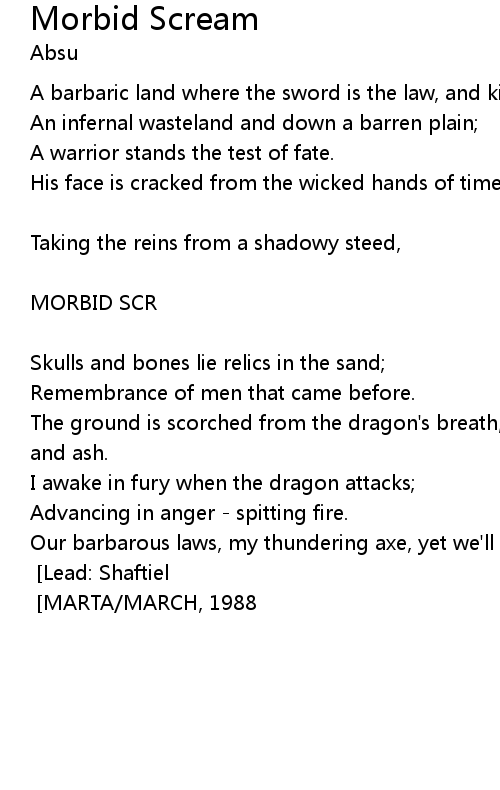 Our barbarous laws, my thundering axe, yet we'll fight the beast to it's death! [Repeat Chorus x 2] [Lead: Shaftiel] [Repeat Chorus x 2] [Repeat 1st Verse] [Repeat Chorus x 2] [MARTA/MARCH, 1988] |