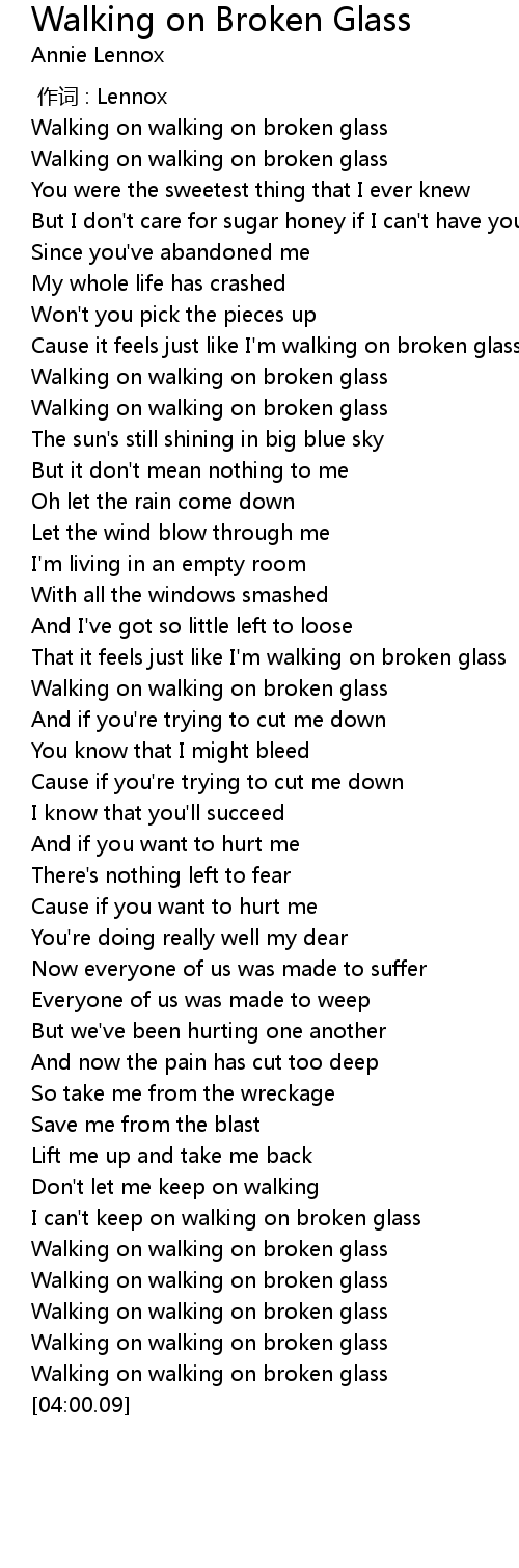 | [00:16.43] | Walking on walking on broken glass |