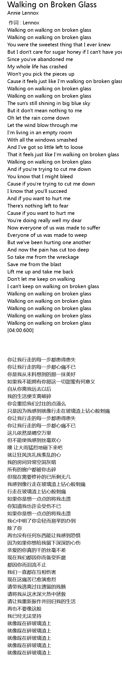 | [00:53.510] | Cause it feels just like I' m walking on broken glass |