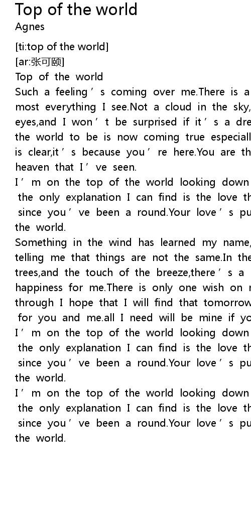 | [01:11.892] | I ' m on the top of the world looking down on creation, and the only explanation I can find is the love that I ' ve found ever since you ' ve been a round. Your love ' s put me on the top of the world. |
