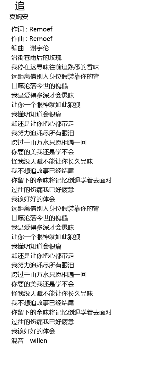 | [00:20.835] | wo ting zai zhe xun wei wang qian zhui shu xi de xiang wei |