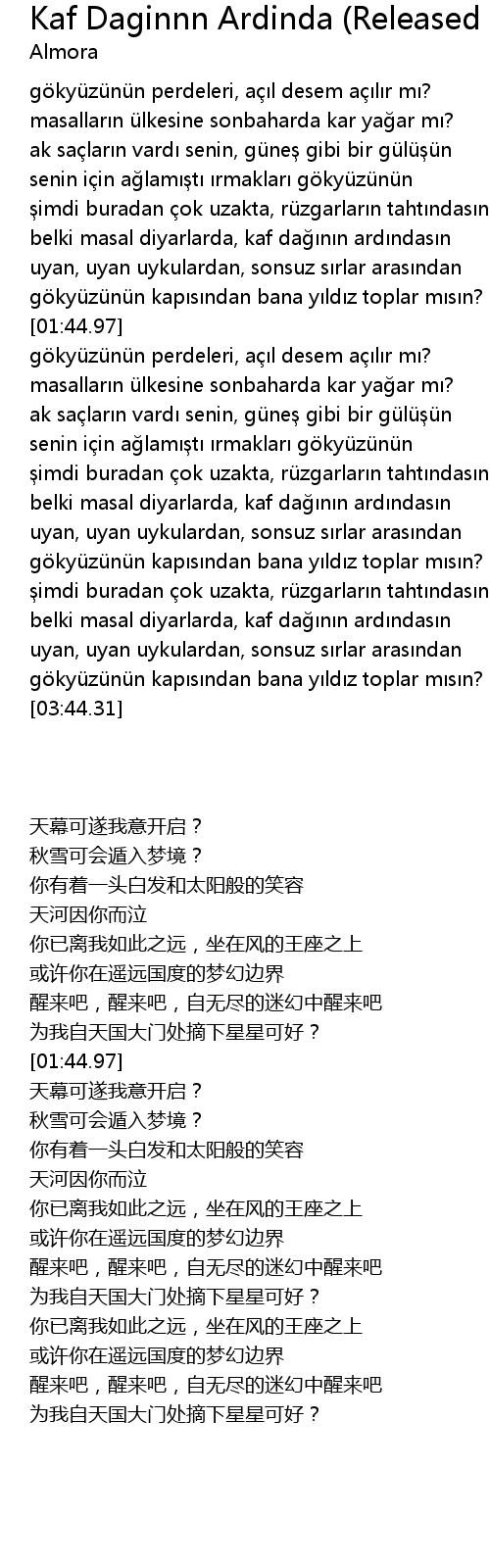 | [03:18.97] | belki masal diyarlarda, kaf da n n ard ndas n |