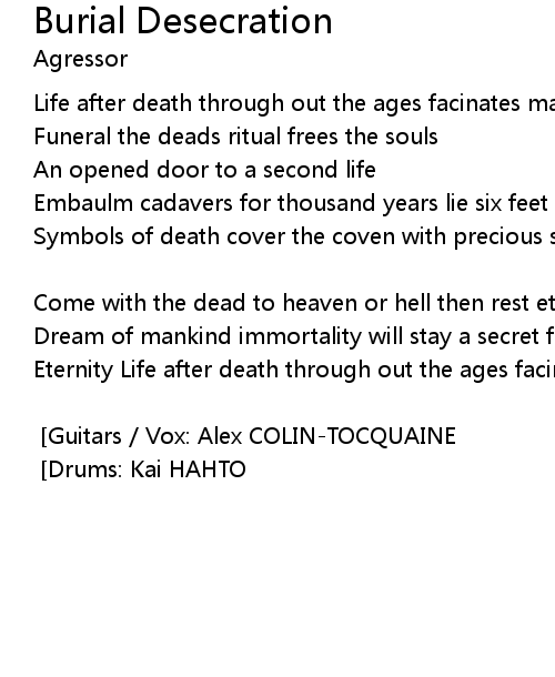 | Burial desecreation [Musicians:] [Guitars / Vox: Alex COLIN-TOCQUAINE] [Bass: Joël GUIGOU] [Drums: Kai HAHTO] |