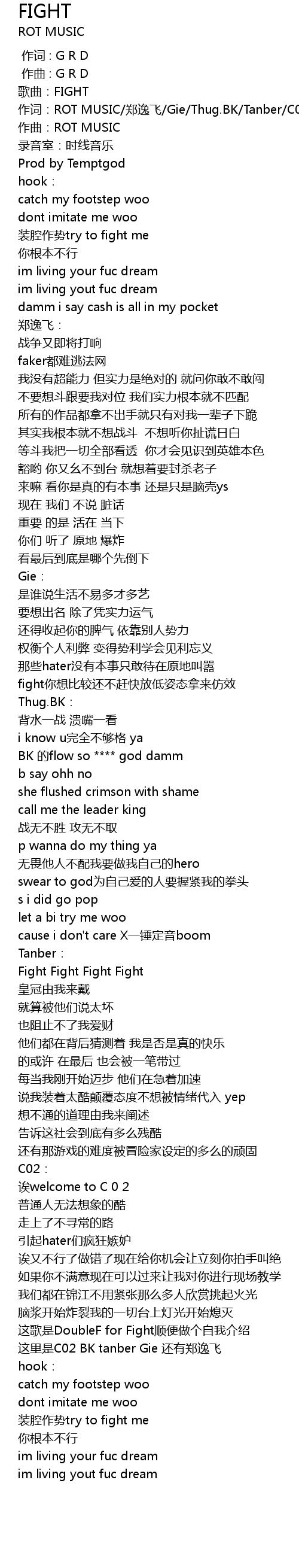 | [00:03.255] | 作词:ROT MUSIC/郑逸飞/Gie/Thug.BK/Tanber/C02 |
