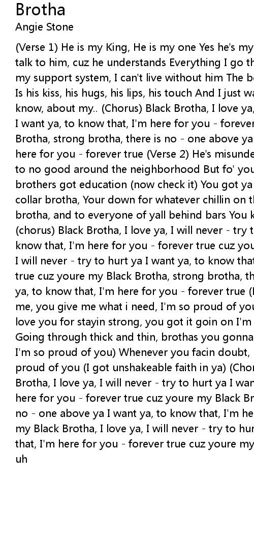 (Verse 1) He is my King, He is my one Yes he's my father, Yes he's my son I can talk to him, cuz he understands Everything I go through and everything I am He's my support system, I can't live without him The best thing since sliced bread, Is his kiss, his hugs, his lips, his touch And I just want the whole world to know, about my.. (Chorus) Black Brotha, I love ya, I will never - try to hurt ya I want ya, to know that, I'm here for you - forever true cuz youre my Black Brotha, strong brotha, there is no - one above ya I want ya, to know that, I'm here for you - forever true (Verse 2) He's misunderstood, some say that he's up to no good around the neighborhood But fo' your information - alot of my brothers got education (now check it) You got ya wallstreet brotha, ya blue collar brotha, Your down for whatever chillin on the corner brother A talented brotha, and to everyone of yall behind bars You know that Angie loves ya (chorus) Black Brotha, I love ya, I will never - try to hurt ya I want ya, to know that, I'm here for you - forever true cuz youre my Black Brotha, I love ya, I will never - try to hurt ya I want ya, to know that, I'm here for you- forever true cuz youre my Black Brotha, strong brotha, there is no - one above ya I want ya, to know that, I'm here for you - forever true (Bridge) You mean so much to me, you give me what i need, I'm so proud of you (I said I'm so proud of you) I love you for stayin strong, you got it goin on I'm so proud of you (I'mmmmmmmmm) Going through thick and thin, brothas you gonna win I'm so proud of you (I said I'm so proud of you) Whenever you facin doubt, brothas gon work it out I'm so proud of you (I got unshakeable faith in ya) (Chorus - twice)(Chorus) Black Brotha, I love ya, I will never - try to hurt ya I want ya, to know that, I'm here for you - forever true cuz youre my Black Brotha, strong brotha, there is no - one above ya I want ya, to know that, I'm here for you - forever true only my Black Brotha, I love ya, I will never - try to hurt ya I want ya, to know that, I'm here for you - forever true cuz youre my ohhhhh, ohhhh ohhhhh uh uh uh uh |