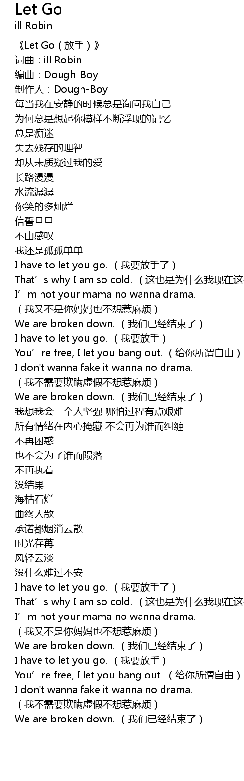 | I don' t wanna fake it wanna no drama 46 wǒ bù xū yào qī mán xū jiǎ bù xiǎng rě má fan | |