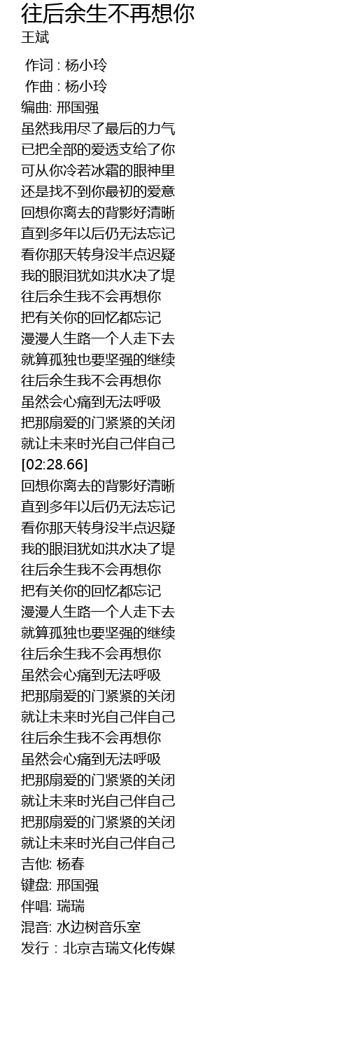 | [01:45.28] | wǎng hòu yú shēng wǒ bú huì zài xiǎng nǐ |