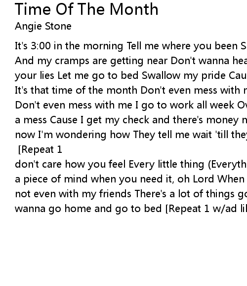 | [1] It's that time of the month Don't even mess with me It's that time of the month Don't even mess with me I go to work all week Overtime I'm puttin' in Now here's a mess Cause I get my check and there's money missin' So many things to do and now I'm wondering how They tell me wait 'till they get it straight But my bills are due right now, right now [Repeat 1] [Repeat 1] Oh, let's keep it real People don't care how you feel Every little thing (Everything) God may heal it Where's a piece of mind when you need it, oh Lord When does it end I can't be bothered, not even with my friends There's a lot of things going through my head Just wanna go home and go to bed [Repeat 1 w/ad libs until fade] |