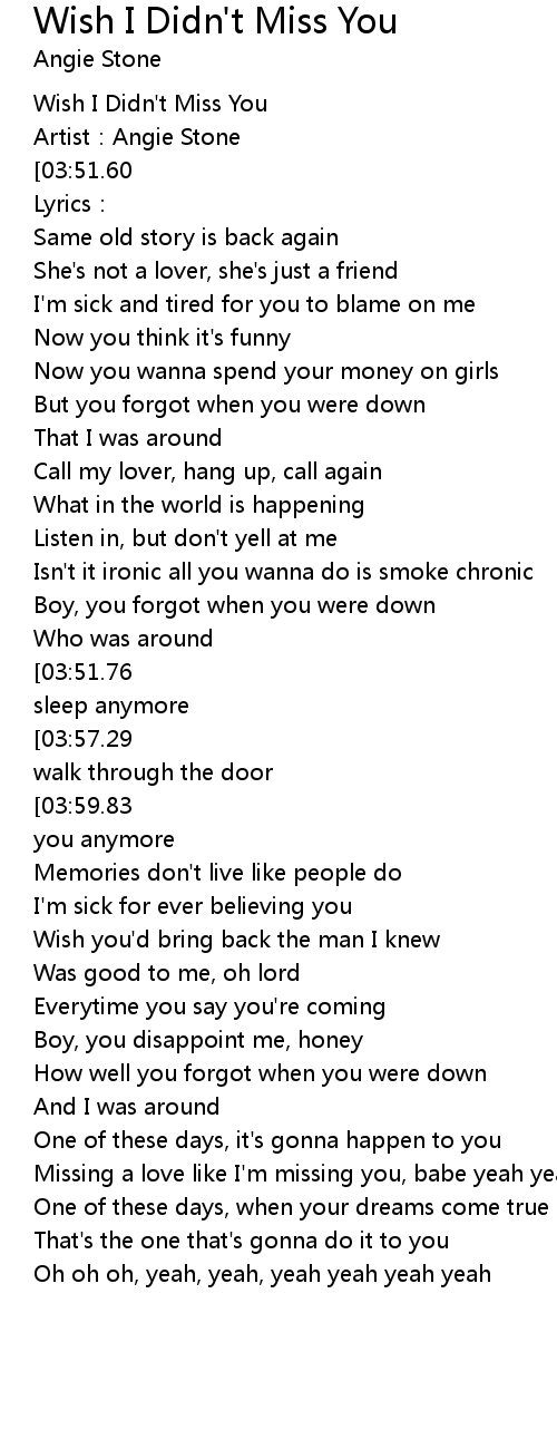 | [04:15.29][03:59.83][03:44.85][02:58.29][02:42.39][01:40.88] | I wish I didn' t miss you anymore |