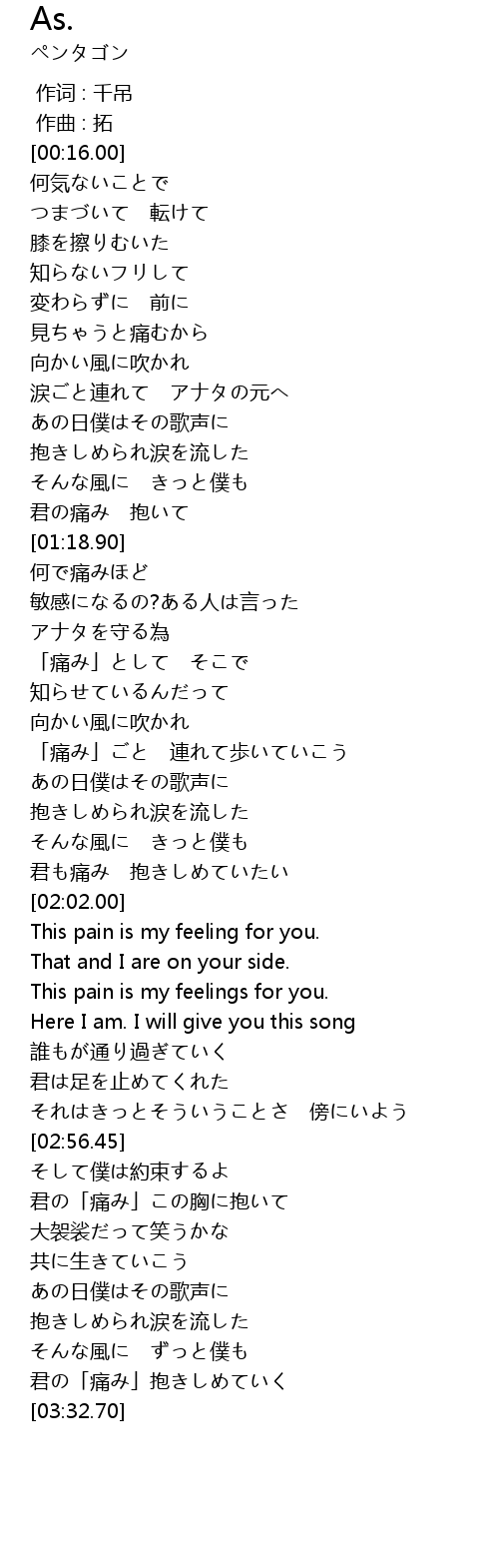 | [01:40.00] | 「痛み」ごと 連れて歩いていこう |