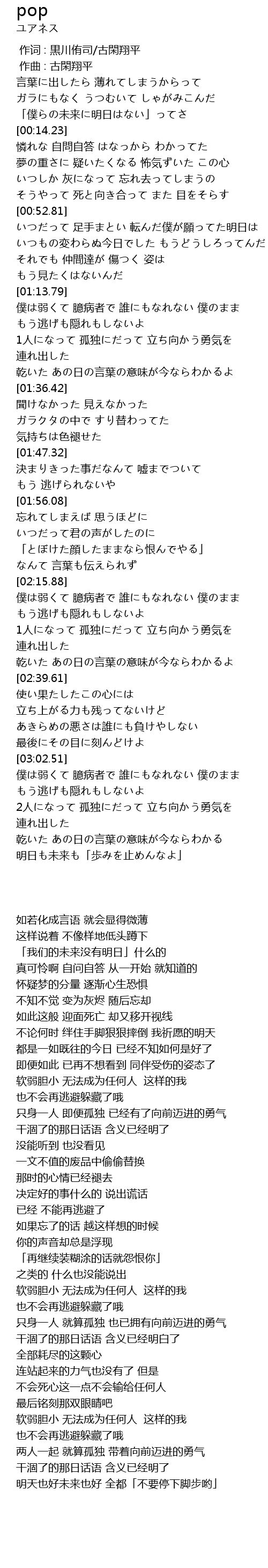 | [00:09.41] | 「僕らの未来に明日はない」ってさ |