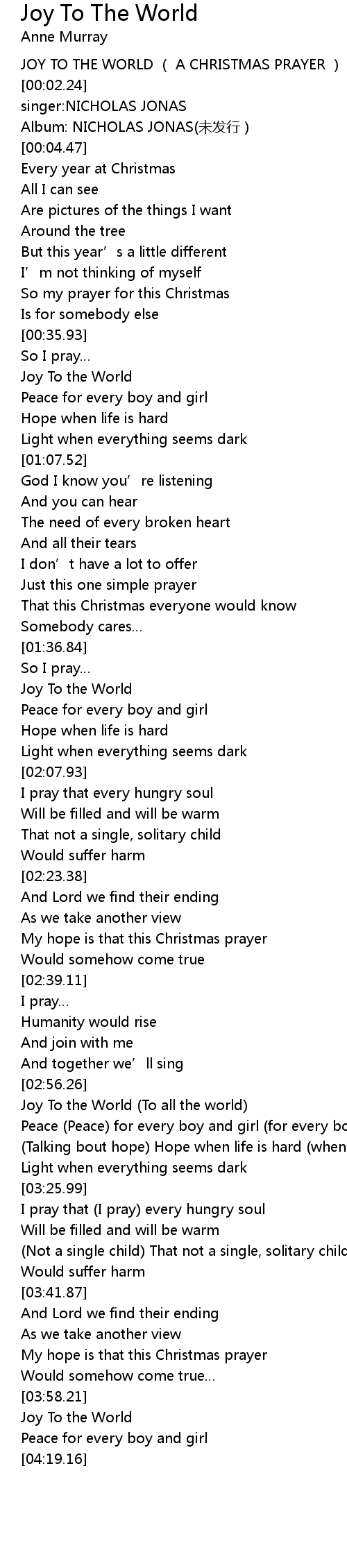 | [00:00.93] | JOY TO THE WORLD A CHRISTMAS PRAYER |