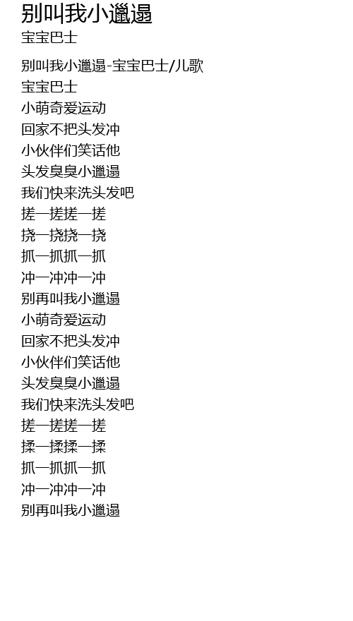 | [00:00.00] | 别叫我小邋遢-宝宝巴士/儿歌 |