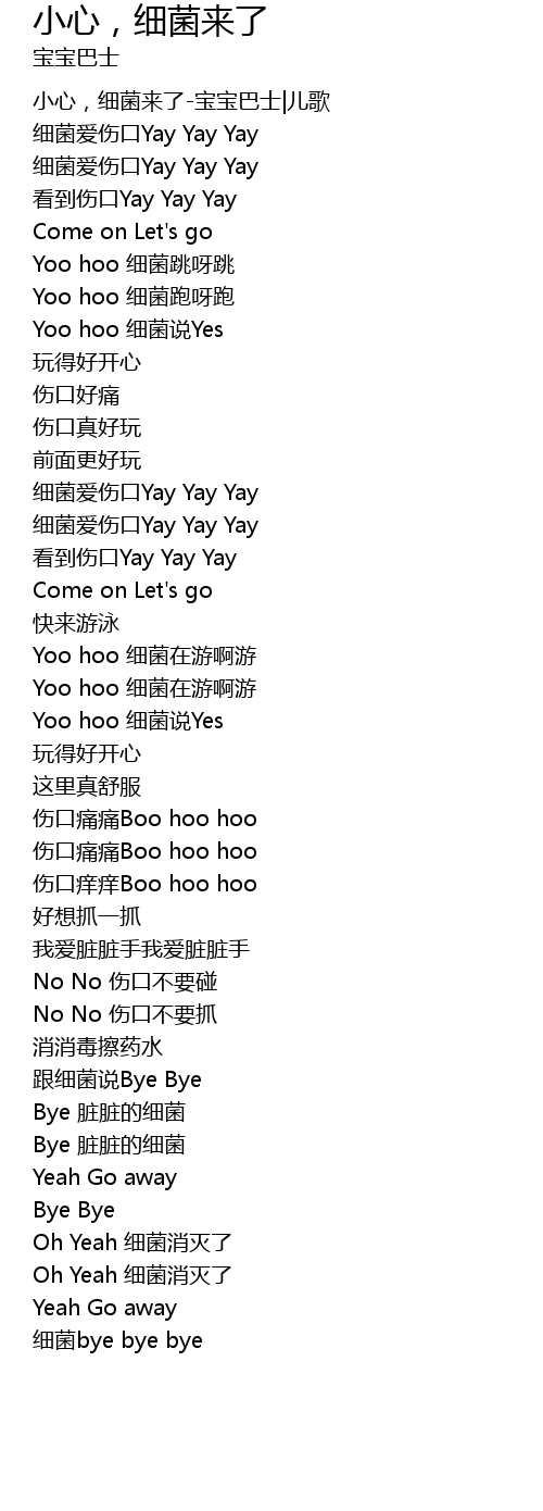 | [00:00.995] | 小心,细菌来了-宝宝巴士|儿歌 |