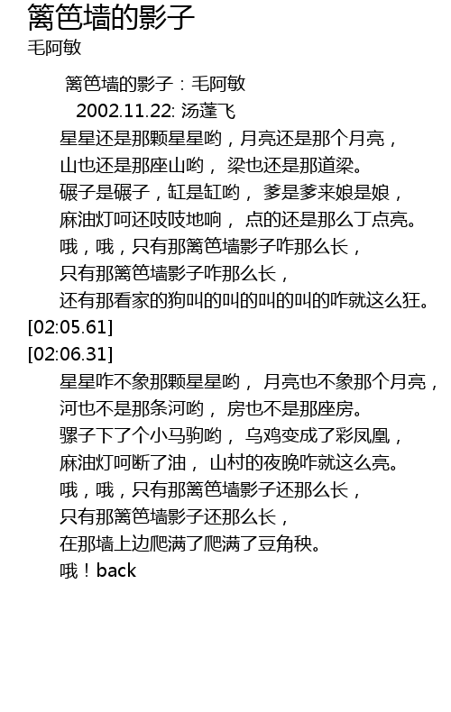| [03:58.01] | 在那墙上边爬满了爬满了豆角秧。 |