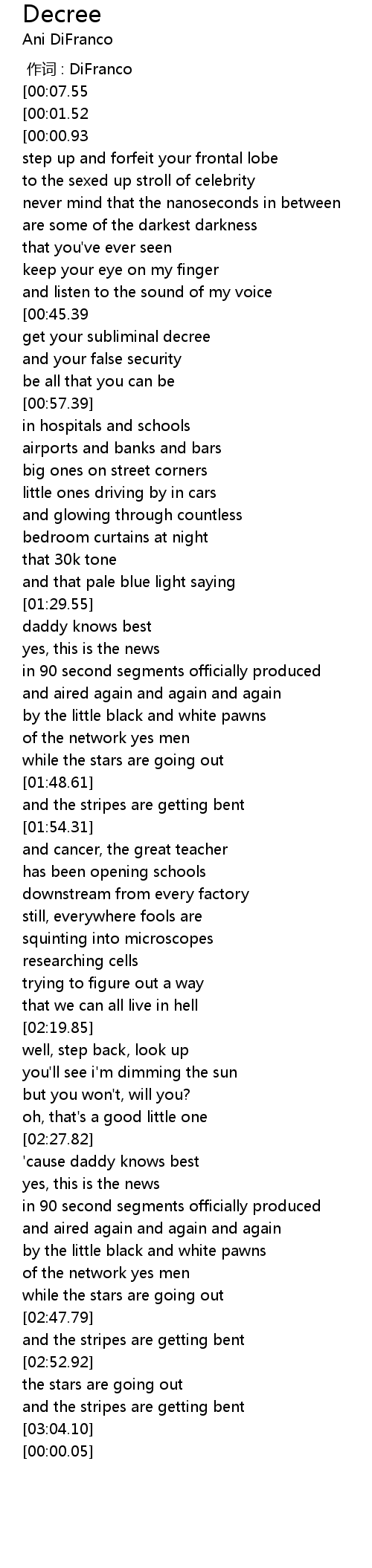 | [03:05.02][00:01.52] | ani difranco-decree |