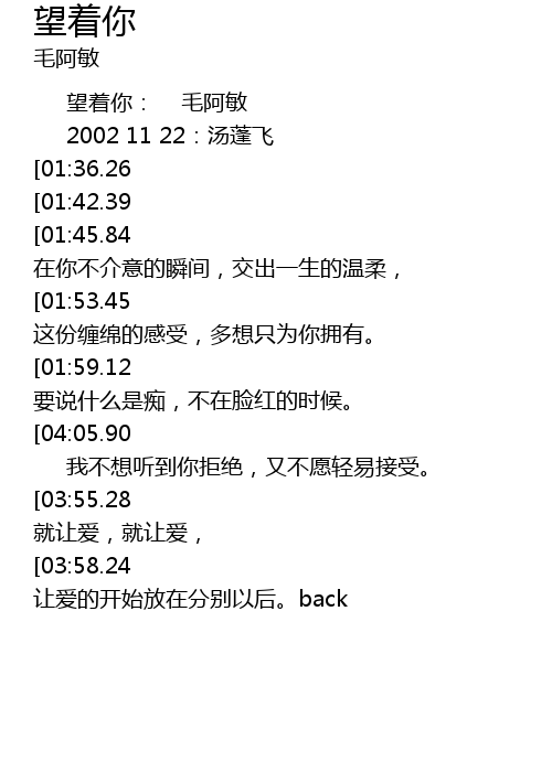 | [00:02.50] | wàng zhe nǐ: máo ā mǐn |