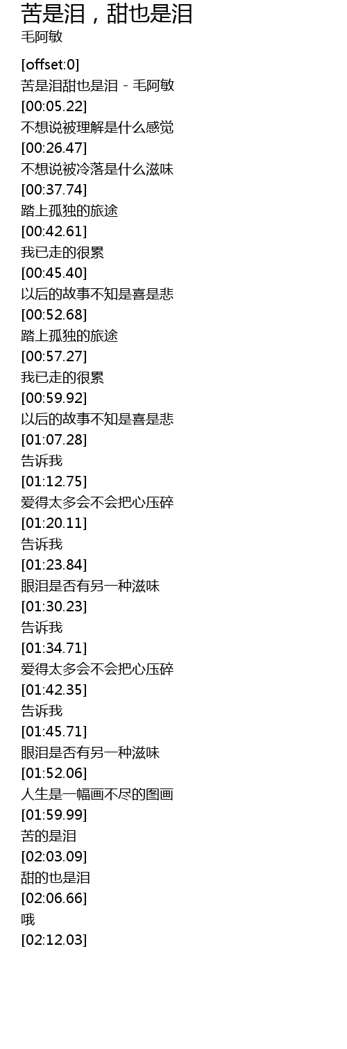 | [00:00.65] | 苦是泪甜也是泪 - 毛阿敏 |