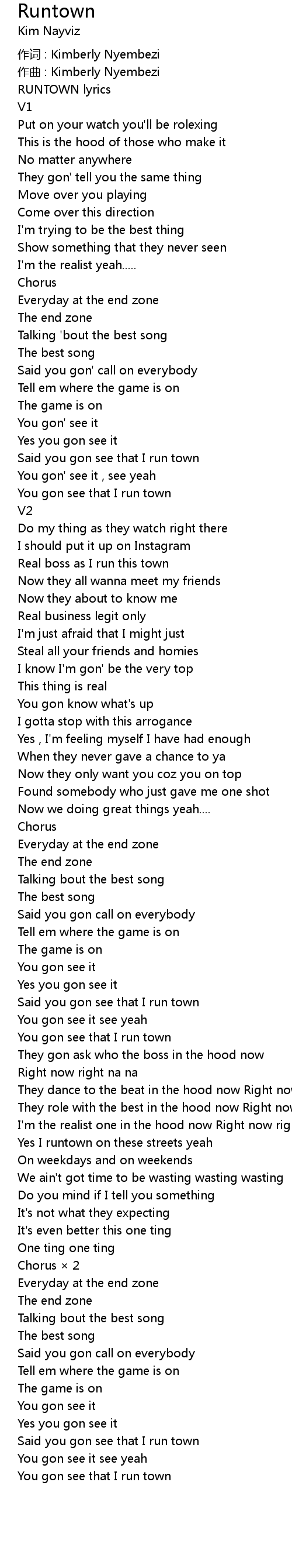 | 作词 : Kimberly Nyembezi | |