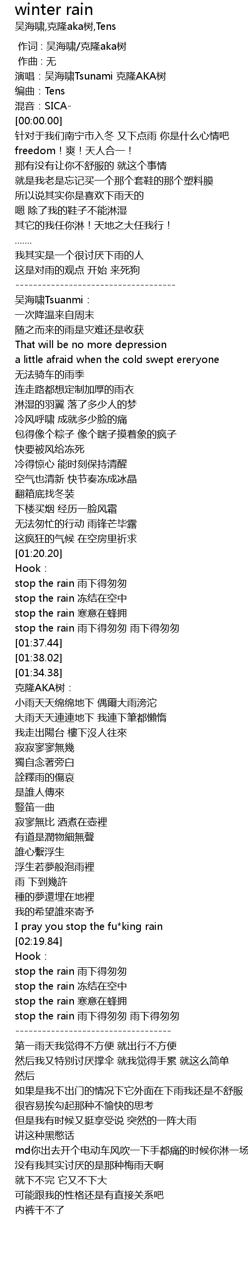 | [01:35.51] | stop the rain 雨下得匆匆 雨下得匆匆 |