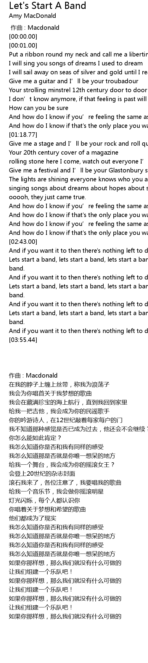 | [03:20.96] | Lets start a band, lets start a band, lets start a band, lets start a band. |