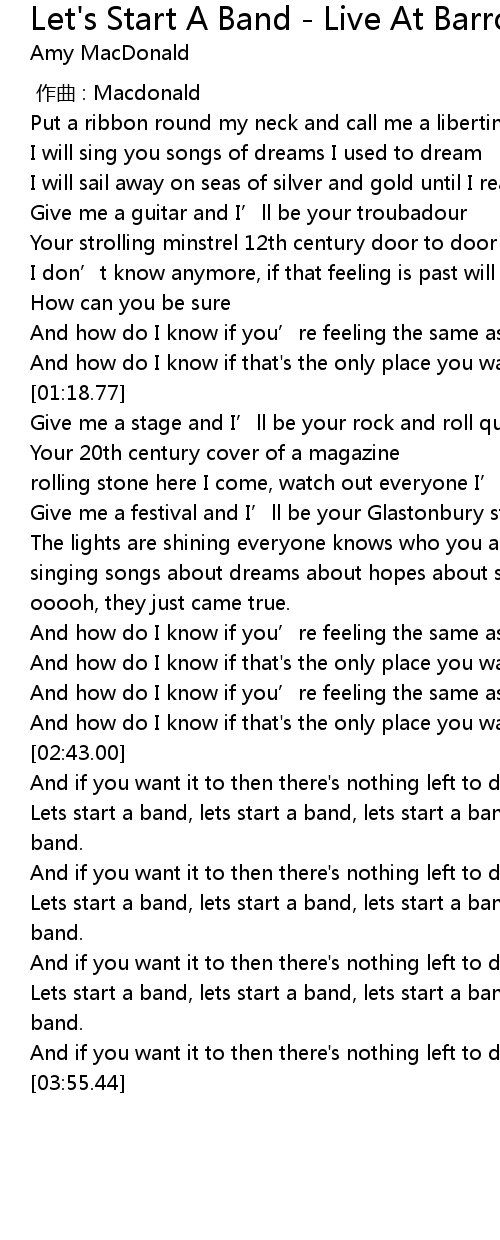 | [03:20.96] | Lets start a band, lets start a band, lets start a band, lets start a band. |