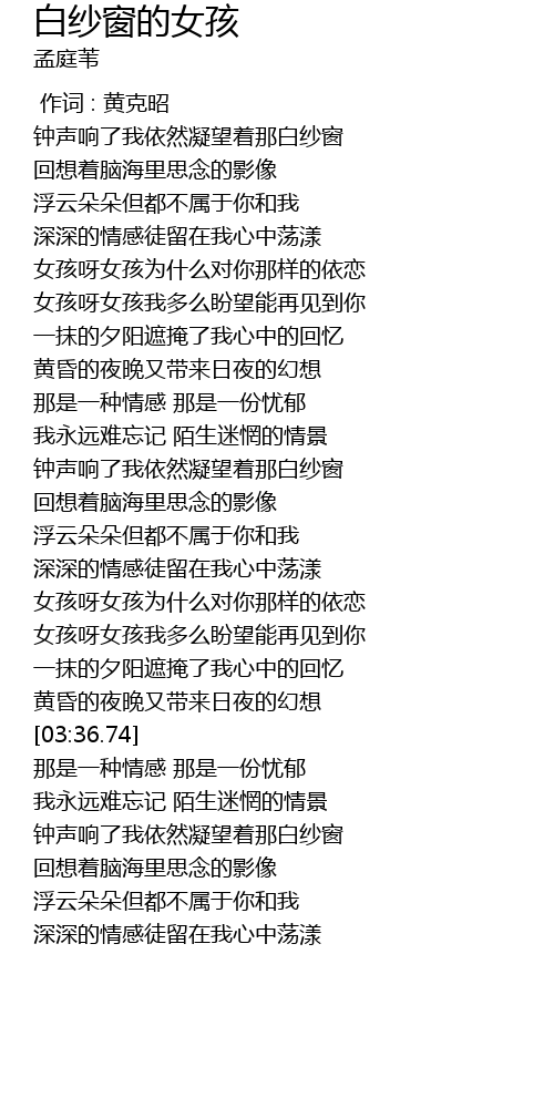 | [00:36.92] | 钟声响了我依然凝望着那白纱窗 |