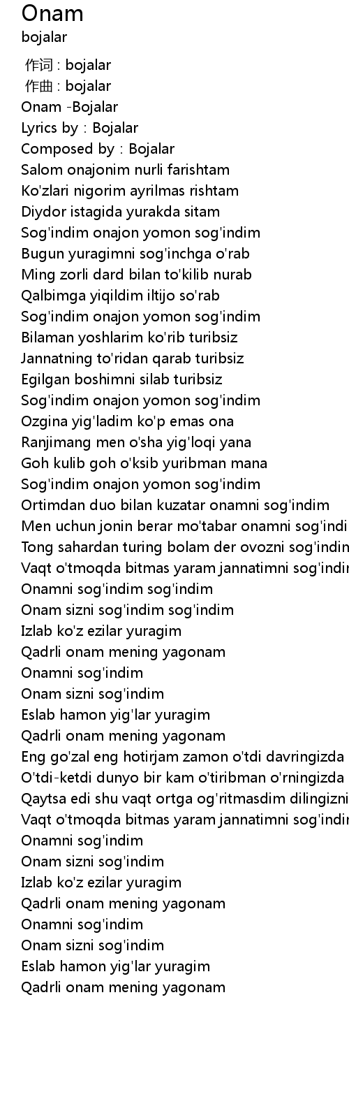 | [04:10.94] | Onamni sog' indim |