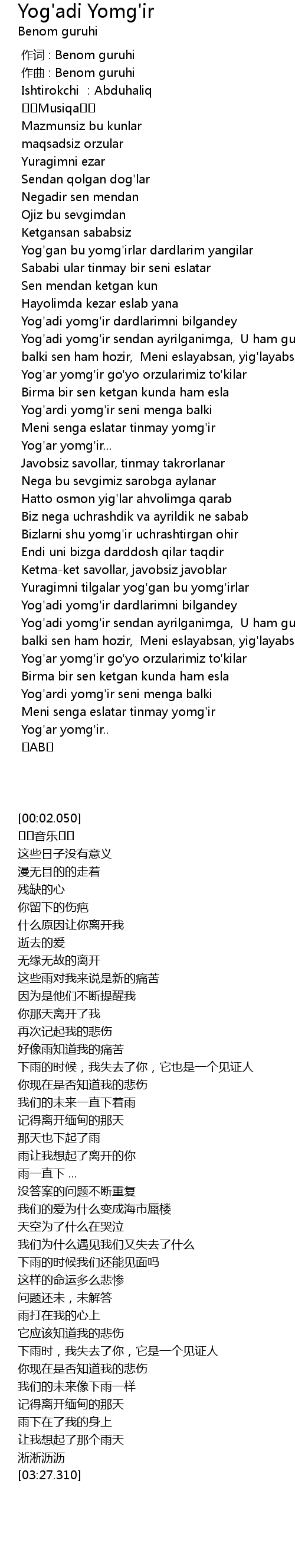 | [03:23.310] | Yog' ar yomg' ir.. |